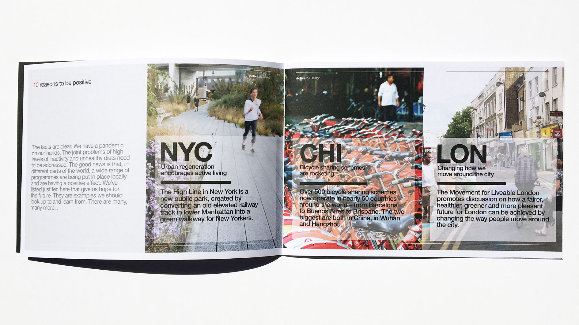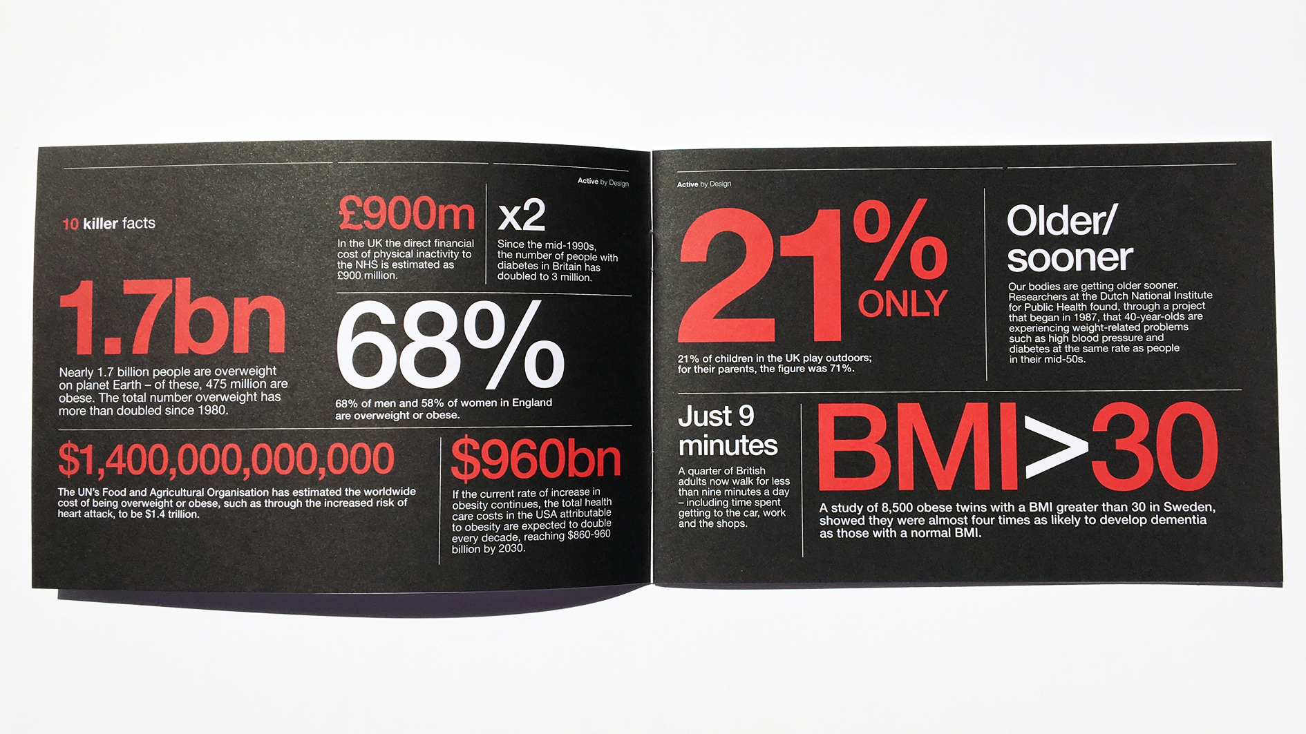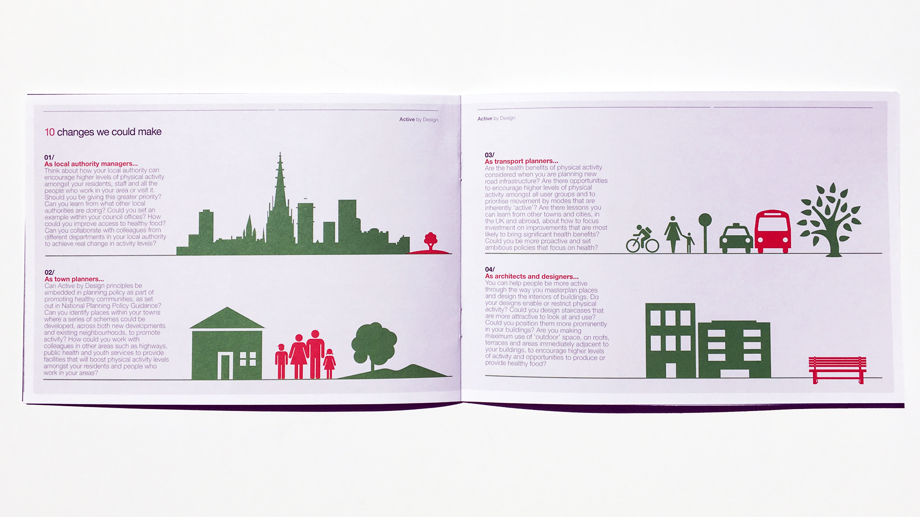It is clear from the research we did that, although the food we eat is important, the most significant contributor to the growth of obesity is the types and level of exercise that people experience. Focusing on this key finding, the team first developed a new identity for the programme that encapsulated what the Design Council is aiming to do – Active by Design. It places the emphasis squarely on the importance of increasing levels of activity to help people stay fit and healthy. Early on, we also decided it was important to focus on what the Design Council knew best and could therefore contribute most to – the design of buildings and open spaces. The role of the Design Council is to act as a catalyst for change, acknowledging there is no ‘silver bullet’ to the obesity problem and that it can only be solved by many, simple, practical solutions.